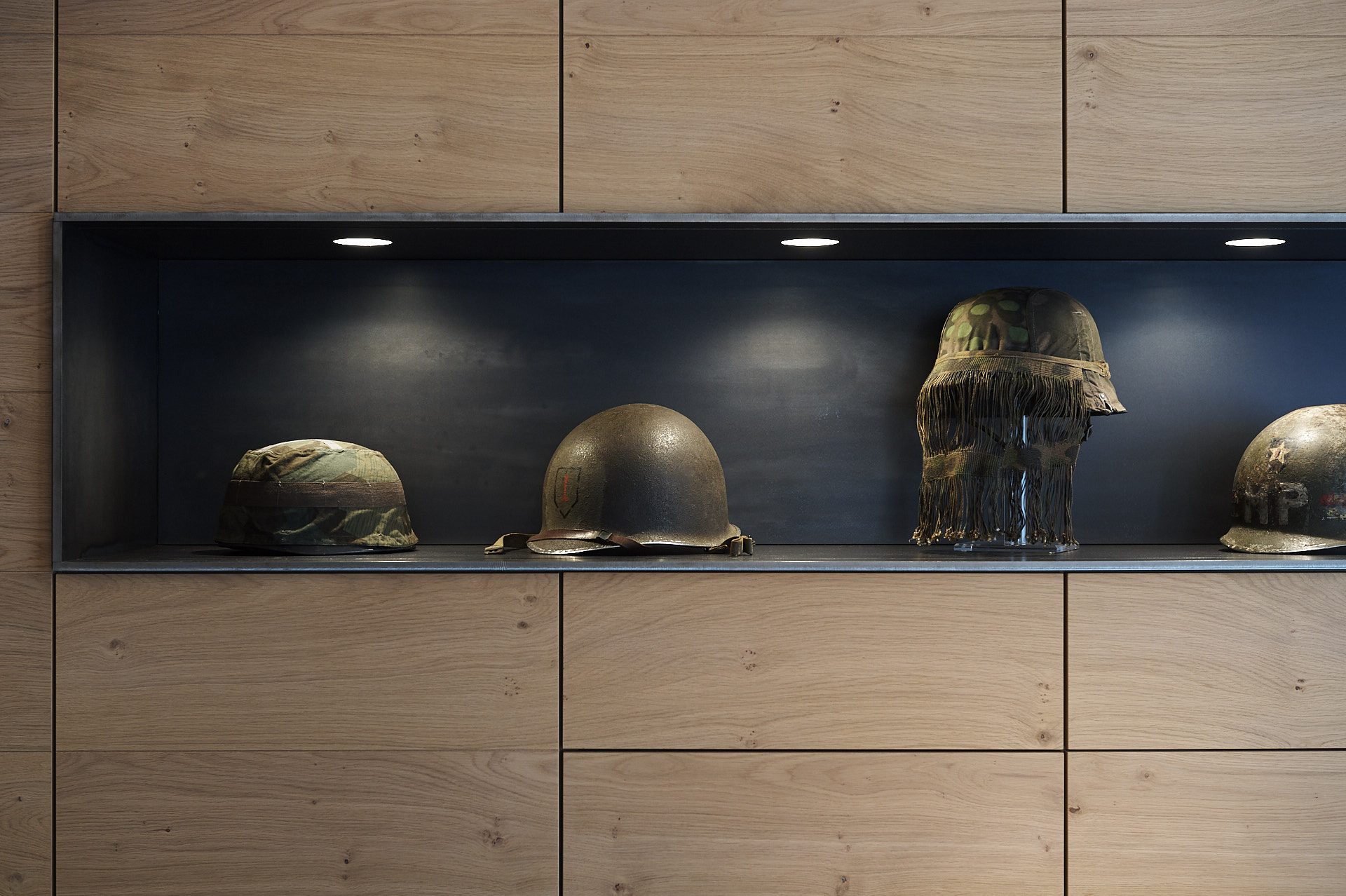 So auch in diesem Fall, wo der Eigentümer ein Faible für präzise Lichtinszenierungen und Helme aus den beiden Weltkriegen hat, die in der Ardennenschlacht, in diesem Teil Belgiens, besonders heftig waren.