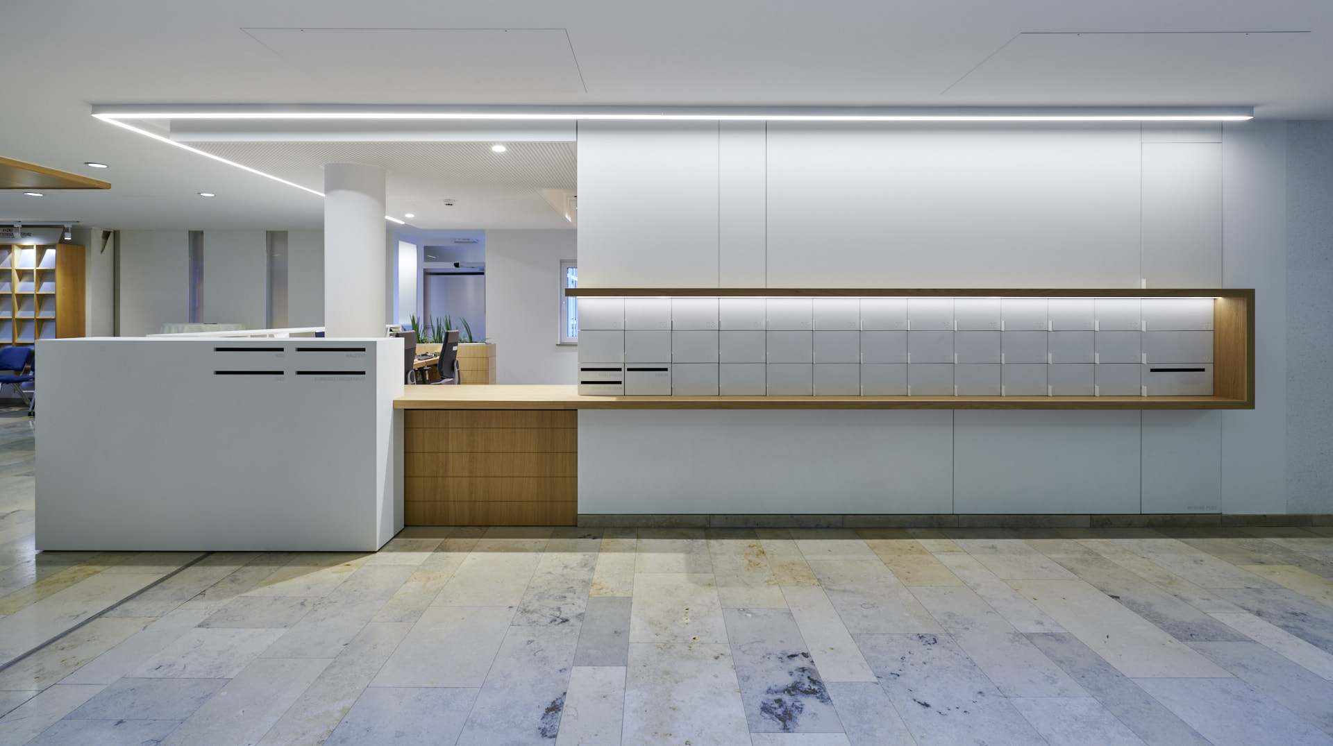 Im seitlichen Bereich befinden sich Schließfächer für die interne Post der Mitarbeiter, die mittels Chip ihr persönliches Fach öffnen können.