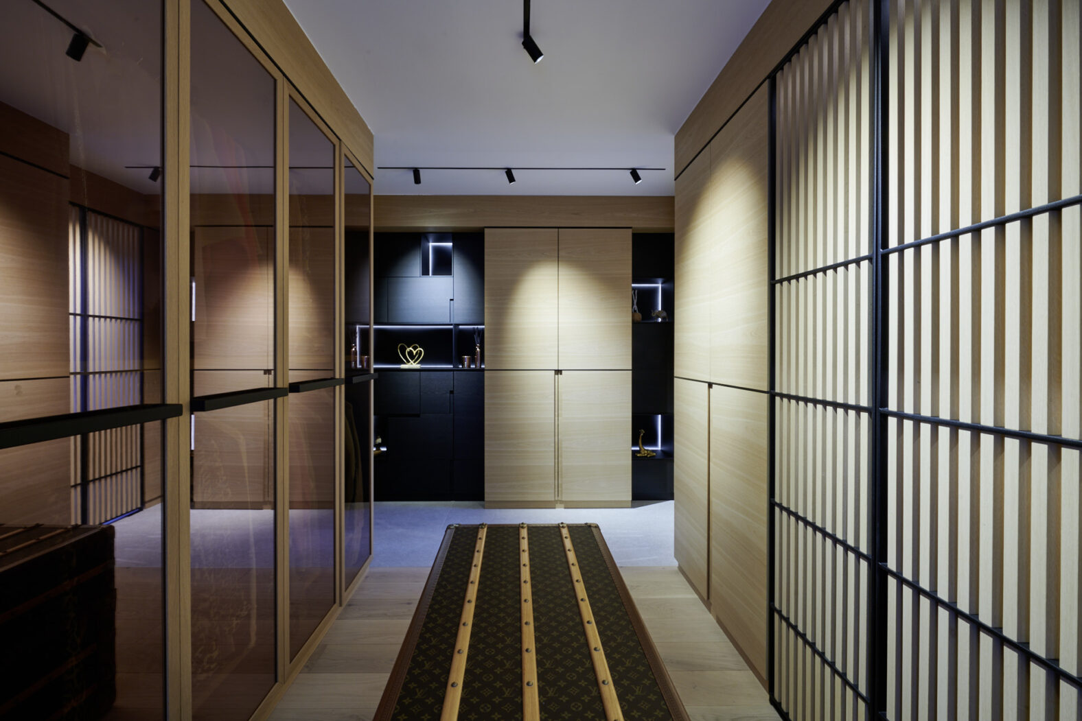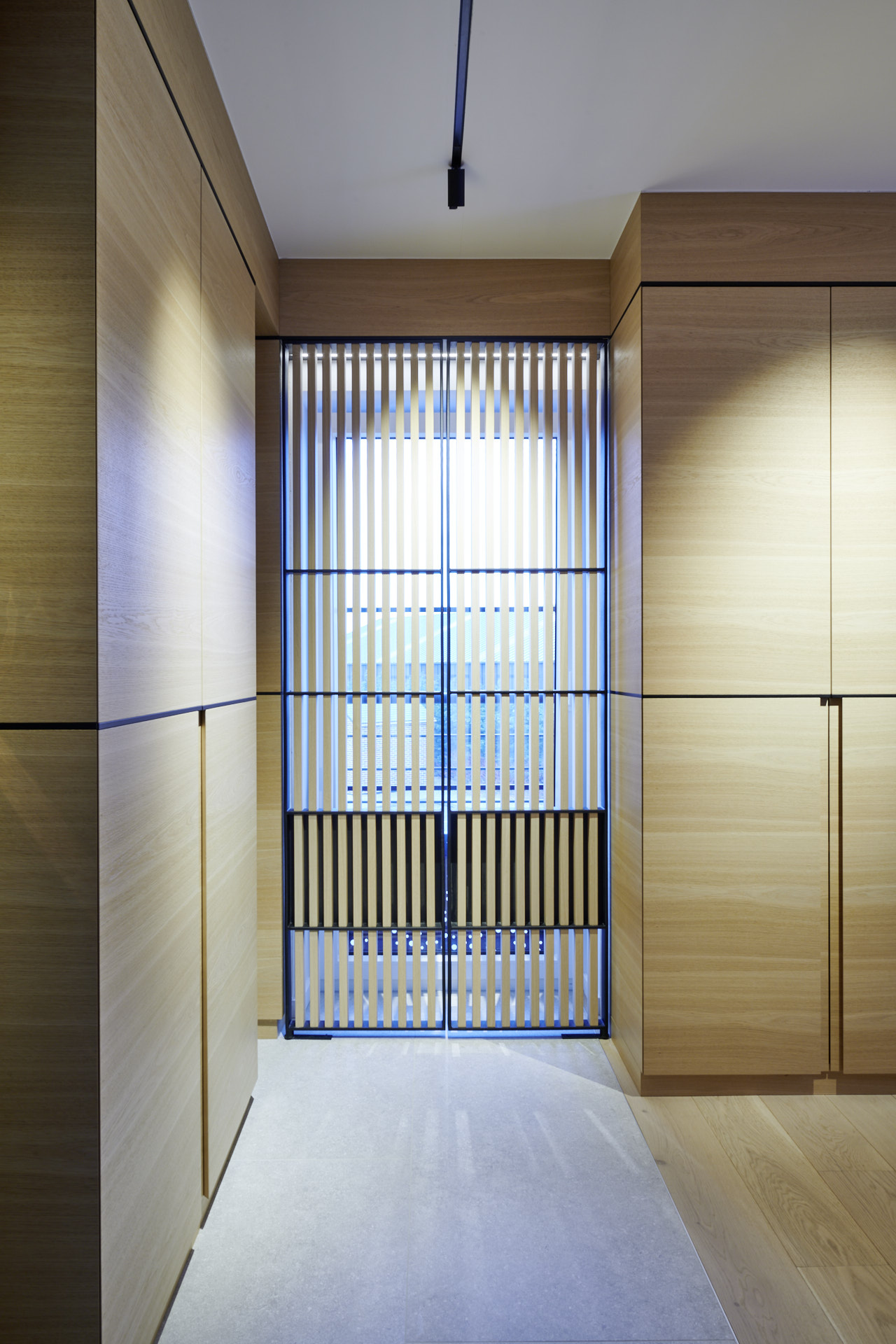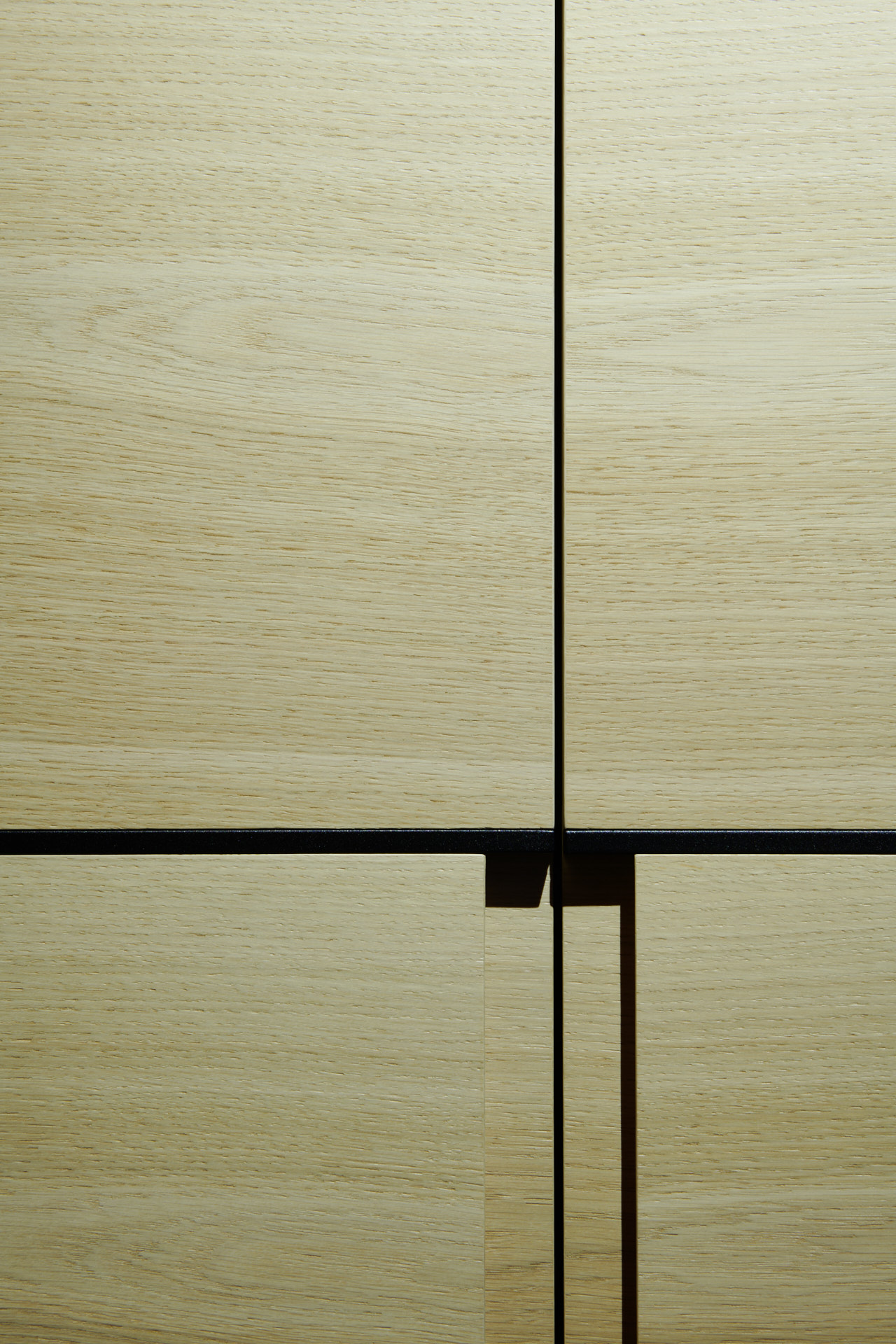 In Zusammenarbeit mit dem Lütticher Architekturbüro Valentiny ist hier ein modernes, von klaren Linien dominiertes Stadtappartement entstanden. Ein interessantes Spiel aus Kontrast zwischen heller Eiche, dunkel lasiertem Eichefurnier und Metall verleiht diesem Appartement klare Anleihen an die japanische Architektursprache. Das unterstreichen auch die Fensterverkleidungen mit ihren vertikalen Linien.