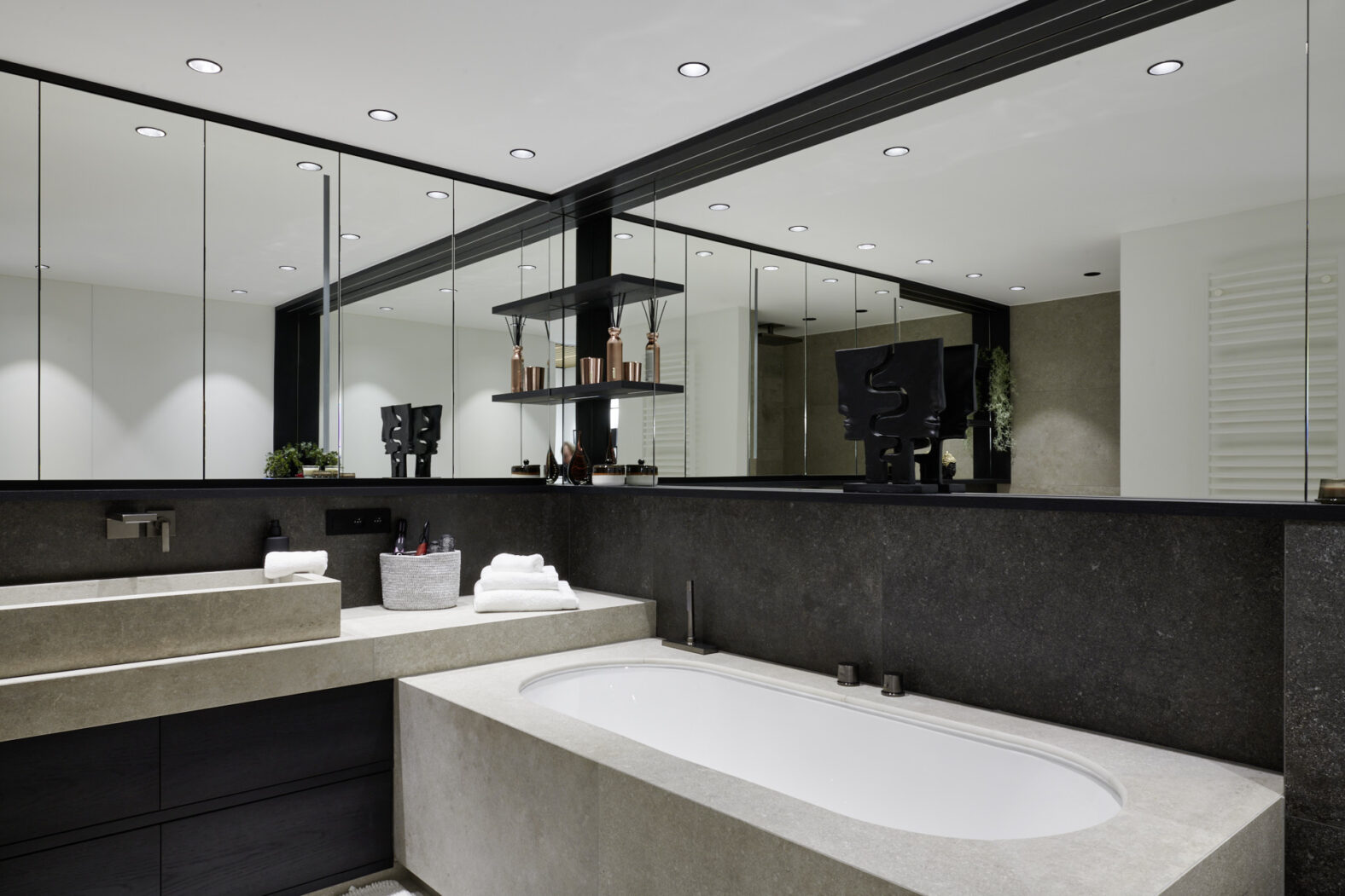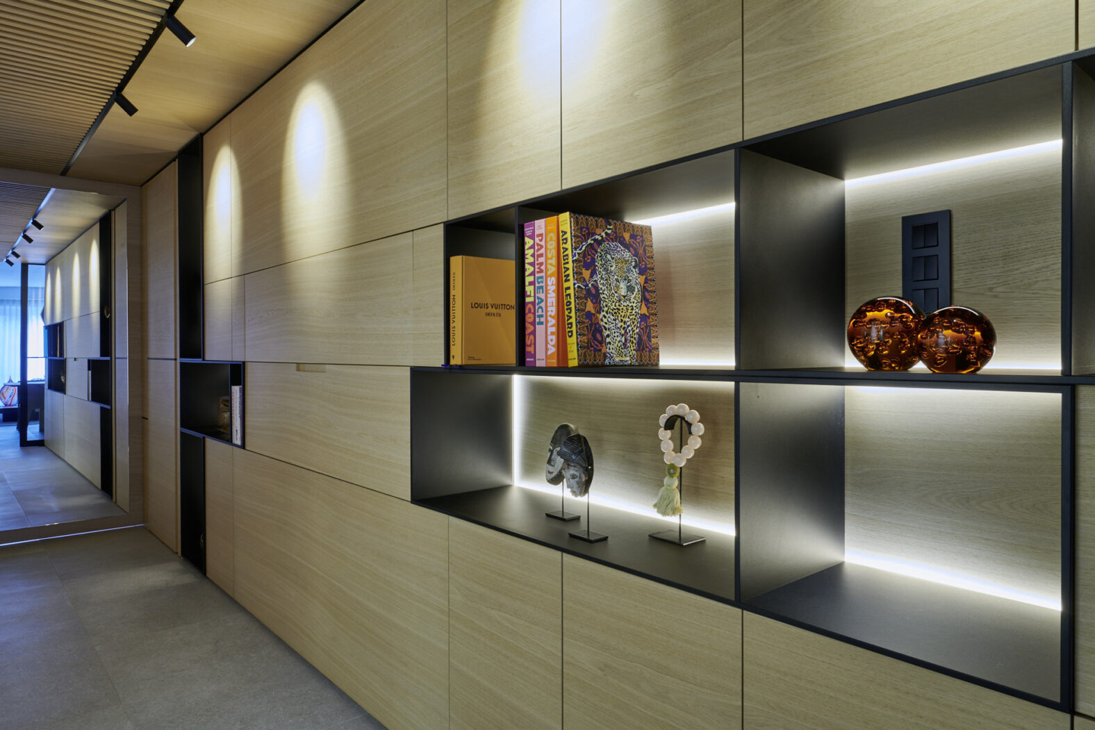 Unser Kunde legte Wert auf großzügigen Stauraum in den clever integrierten Einbaumöbeln, die der Wohnung einen puristischen Touch verleihen, ohne dabei kühl zu wirken. Durch die Kombination aus warmen Materialien, durchdachter Beleuchtung und klaren Formen entsteht eine Atmosphäre, die Ordnung und Wohnlichkeit miteinander vereint.