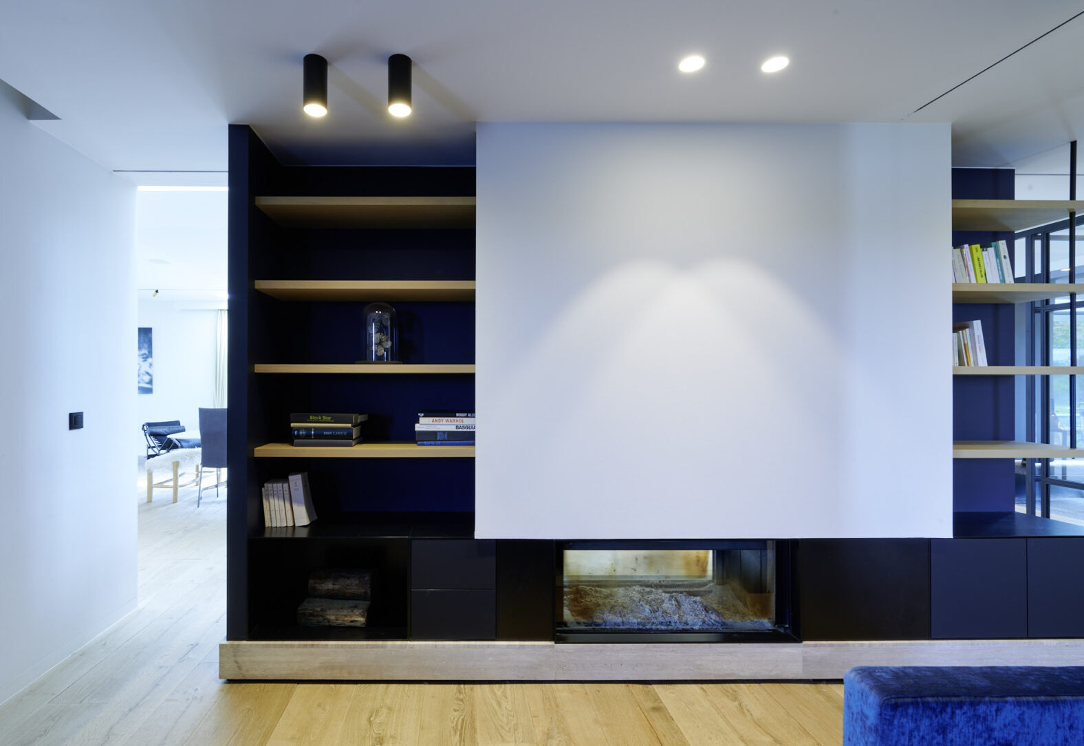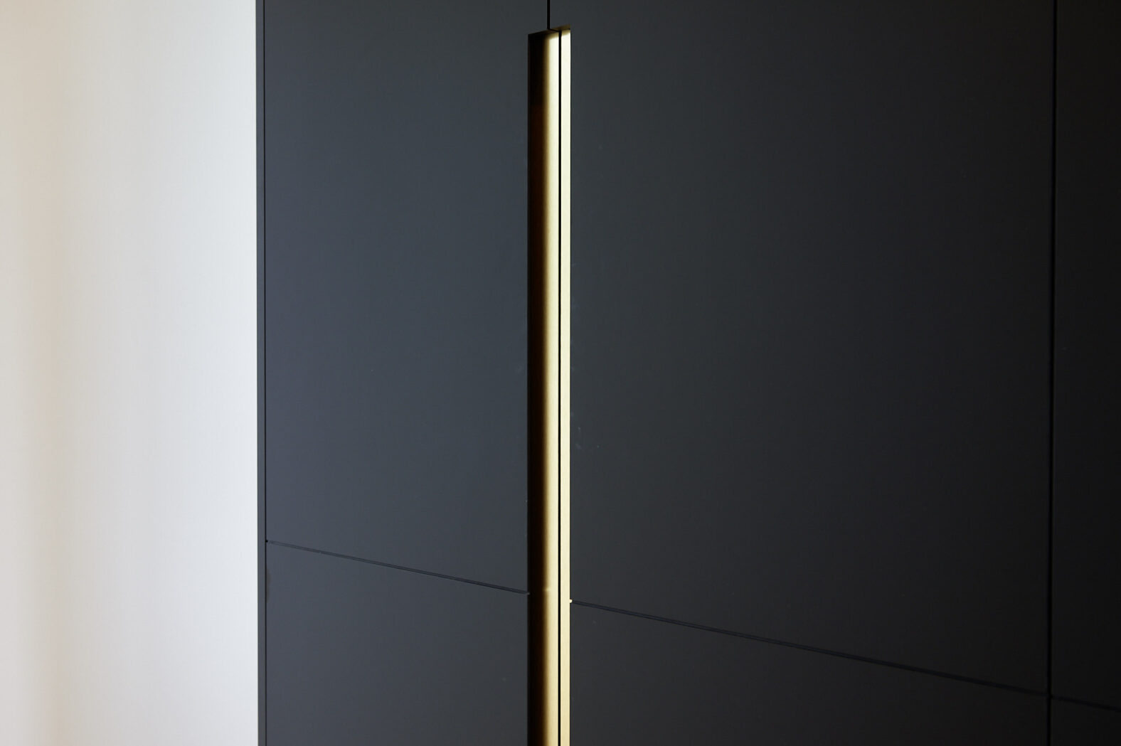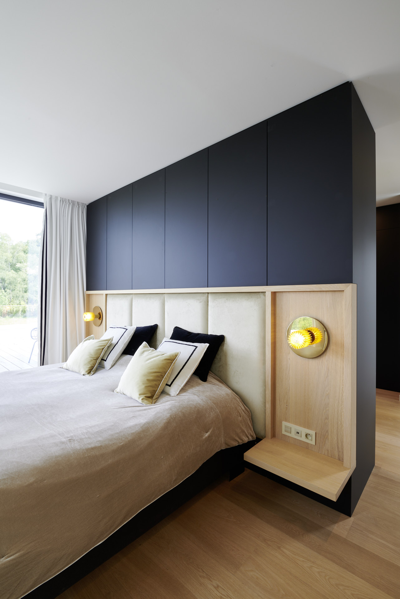 Die maßgefertigte Einrichtung des Wohnhauses überzeugt durch ein stimmiges Zusammenspiel aus dunklen und weißen Fronten sowie warmem Holz. Hochwertige Materialien und durchdachte Stauraumlösungen schaffen eine elegante, zeitlose Wohnatmosphäre, die konsequent auf das Wohlbefinden unseres Kunden abgestimmt ist. Auch im Schlafzimmer setzt sich dieses Gestaltungskonzept unter anderem mit einem individuell integrierten Bettkopfteil mit Stauraum, einem weichen Textilelement und stimmungsvoller Beleuchtung fort.