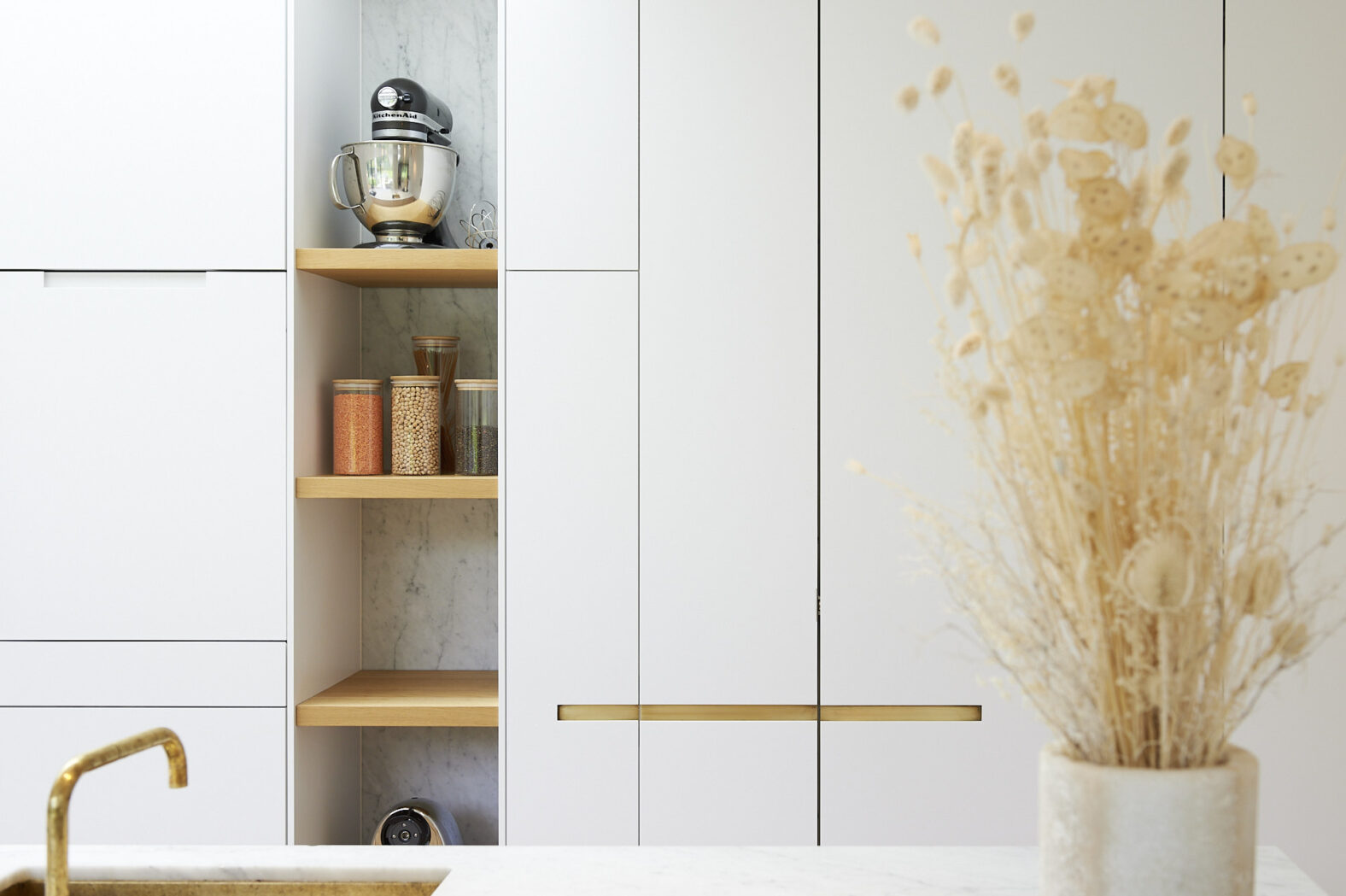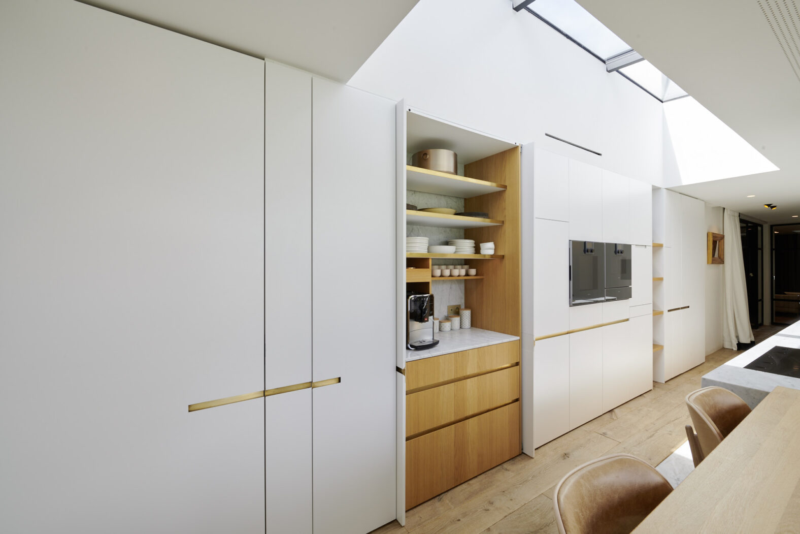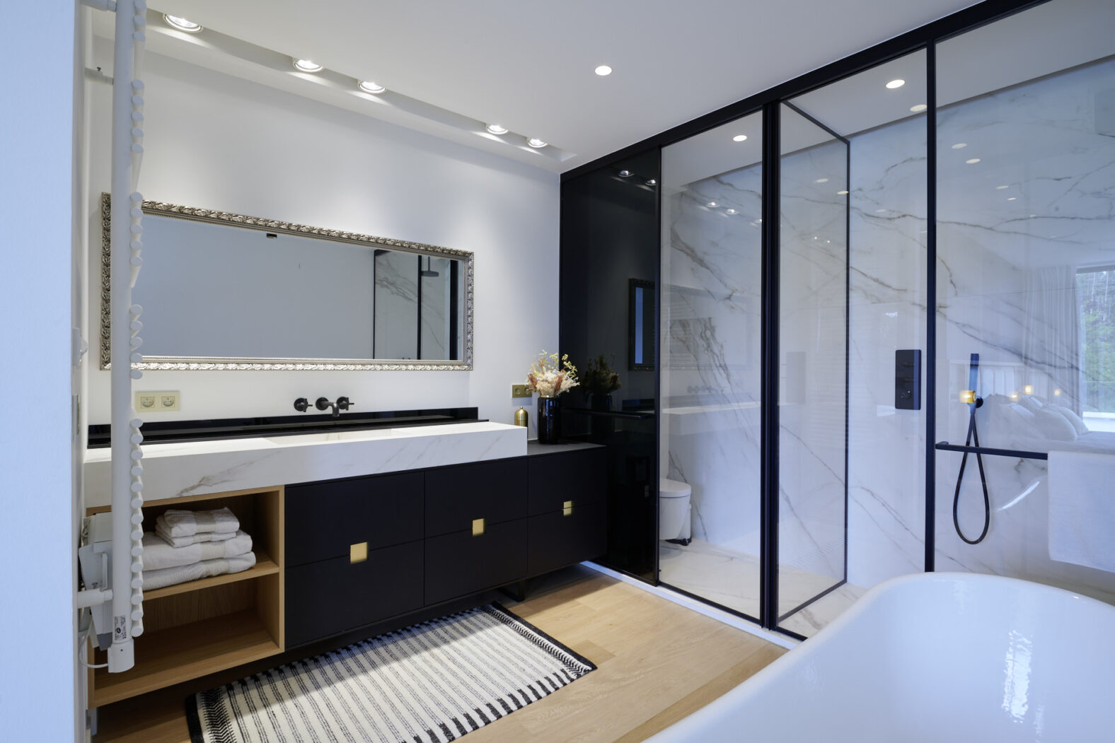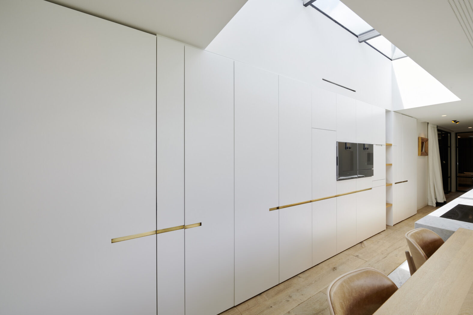 Die maßgefertigte Einrichtung des Wohnhauses überzeugt durch ein stimmiges Zusammenspiel aus dunklen und weißen Fronten sowie warmem Holz. Hochwertige Materialien und durchdachte Stauraumlösungen schaffen eine elegante, zeitlose Wohnatmosphäre, die konsequent auf das Wohlbefinden unseres Kunden abgestimmt ist. Auch im Schlafzimmer setzt sich dieses Gestaltungskonzept unter anderem mit einem individuell integrierten Bettkopfteil mit Stauraum, einem weichen Textilelement und stimmungsvoller Beleuchtung fort.
