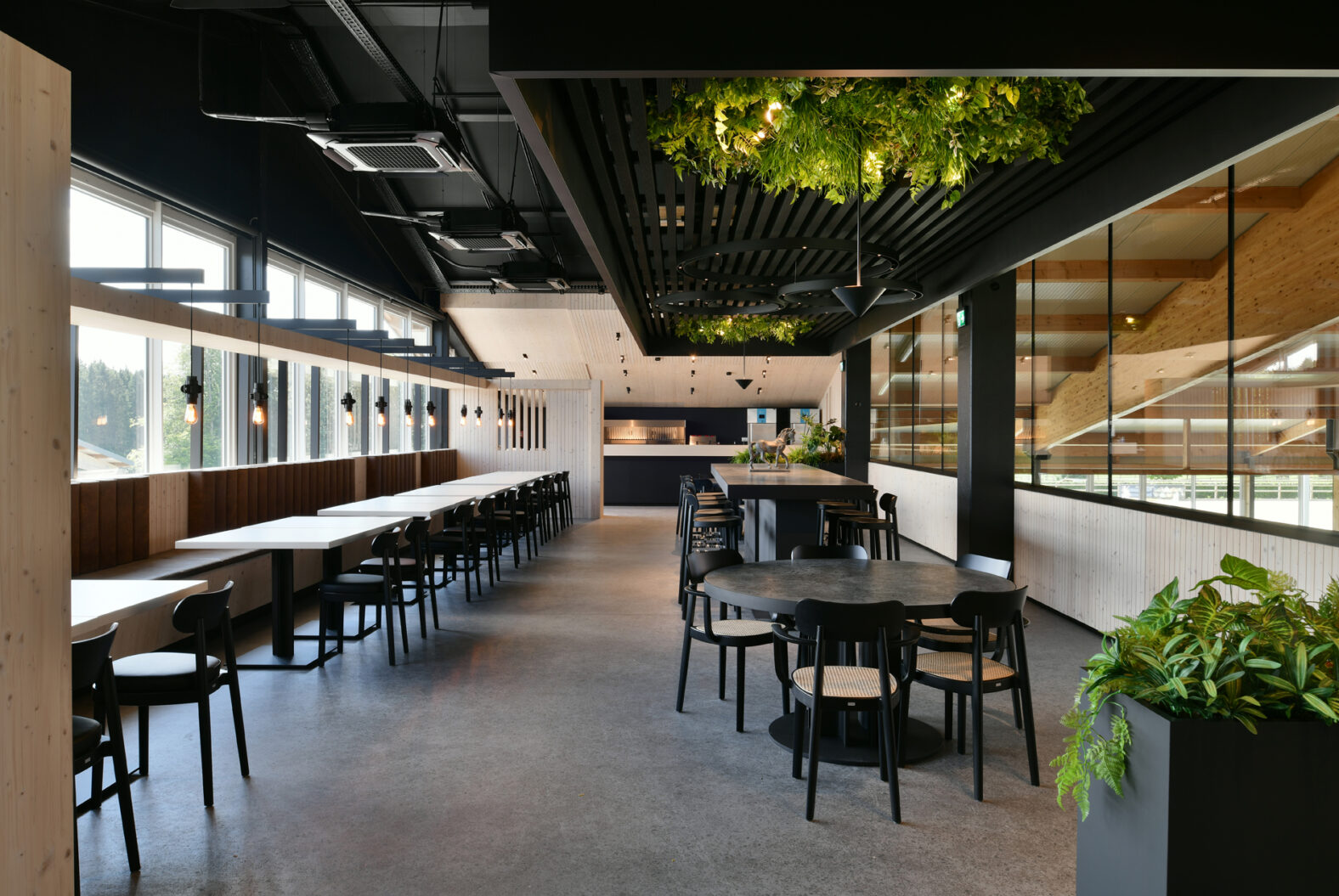 Das private Restaurant in der Reithalle steht sowohl während Turnieren als auch für geladene Reitgäste zur Verfügung. Die Räumlichkeiten bieten Platz für Verköstigungen während der Veranstaltungen und für gemeinsame Mahlzeiten nach den Wettkämpfen. Besonders beeindruckend ist das außergewöhnliche Design, das moderne Elemente harmonisch mit dem charakteristischen Charme der Reithalle verbindet und so eine unverwechselbare Atmosphäre schafft.