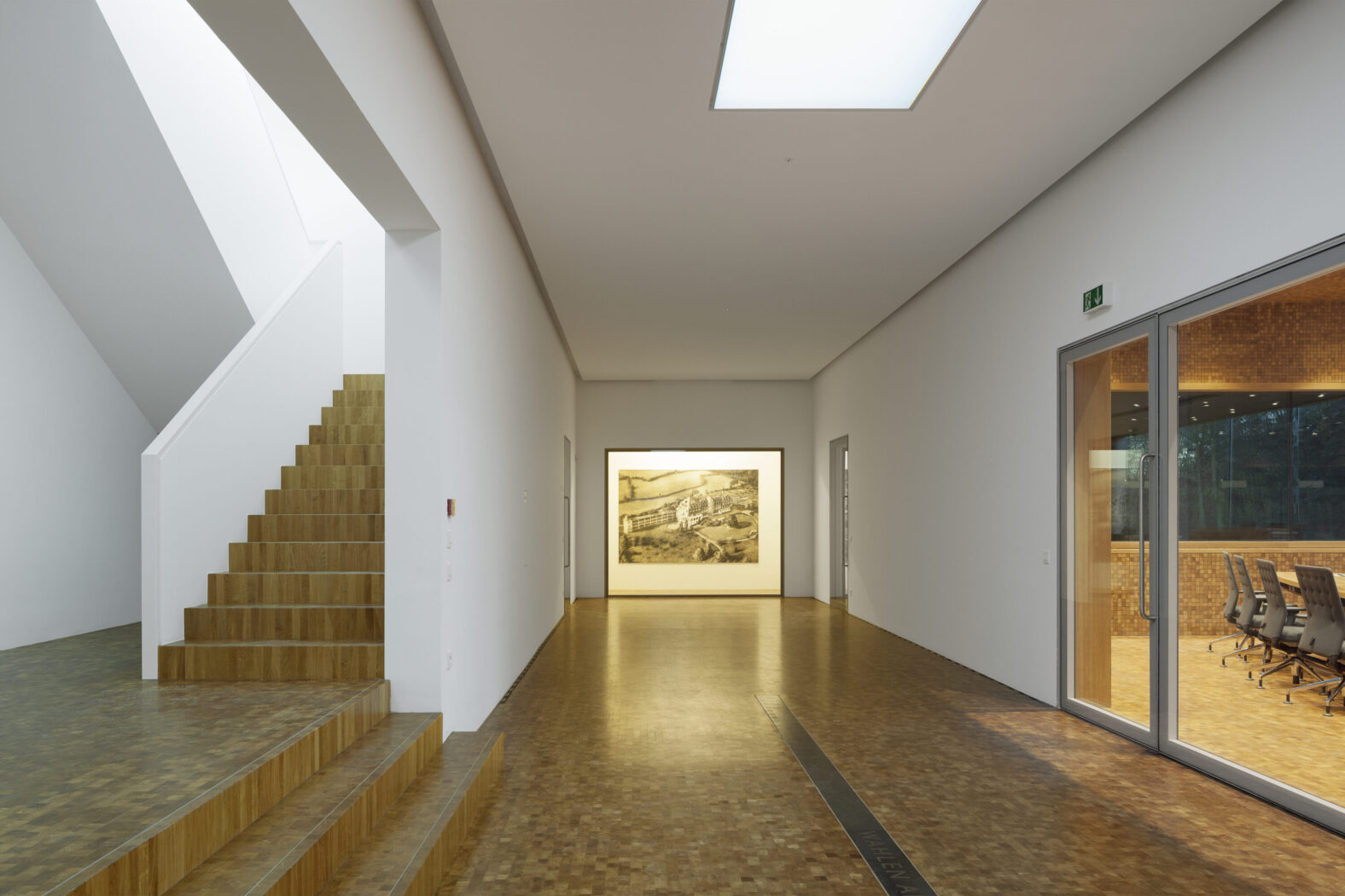 Im Flurbereich des bestehenden Hauptgebäudes wurde Echtholzparkett verlegt und durch eine passende Tischverkleidung ergänzt. Zudem erfolgte die Installation neuer Zimmertüren für die Büros und Sitzungsräume, wodurch Funktionalität und gestalterische Einheit harmonisch miteinander verbunden werden.